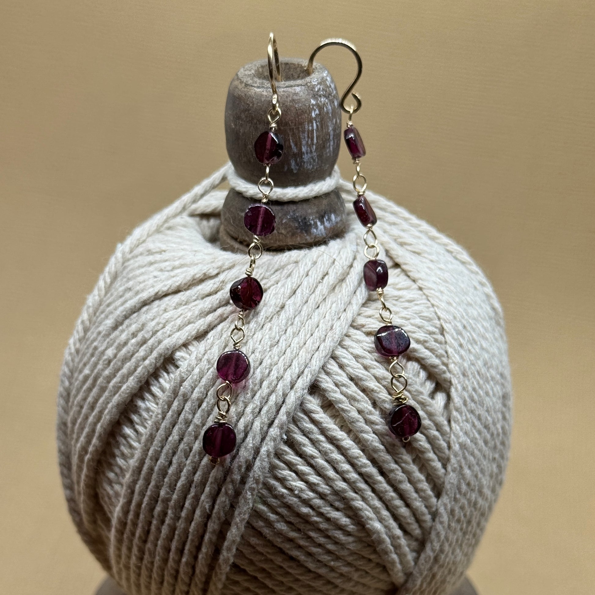 These handmade gold-filled garnet drop earrings feature rich, deep red faceted garnet gemstones, carefully linked by hand using fine 14k gold-filled wire. The elongated design creates gentle movement, allowing the garnets to catch the light beautifully with every step.