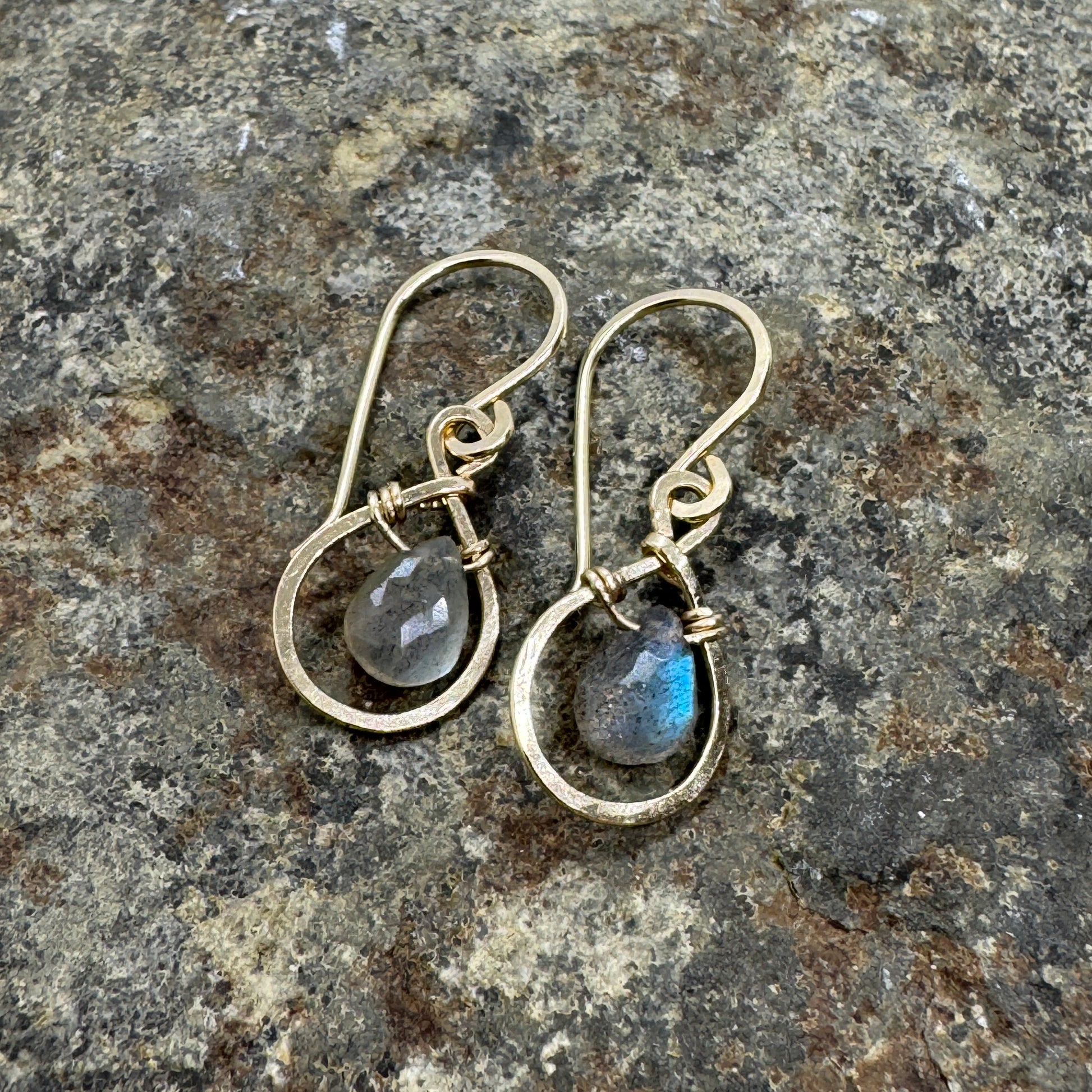 Shifting between soft grey, blue, and flashes of iridescent light, these Dew Drop Labradorite Earrings capture the quiet magic of this beautiful gemstone. Each pair is shaped by hand from gold-filled wire into a gentle teardrop form, with a faceted labradorite drop wrapped securely at the centre.