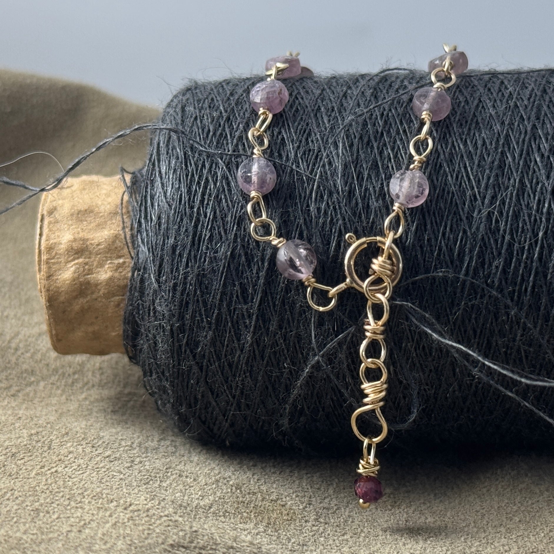 Delicate and radiant, this bracelet is hand-wrapped in 14k gold-filled wire and adorned with natural lilac spinel gemstones, each one shimmering with soft violet hues that catch the light beautifully.